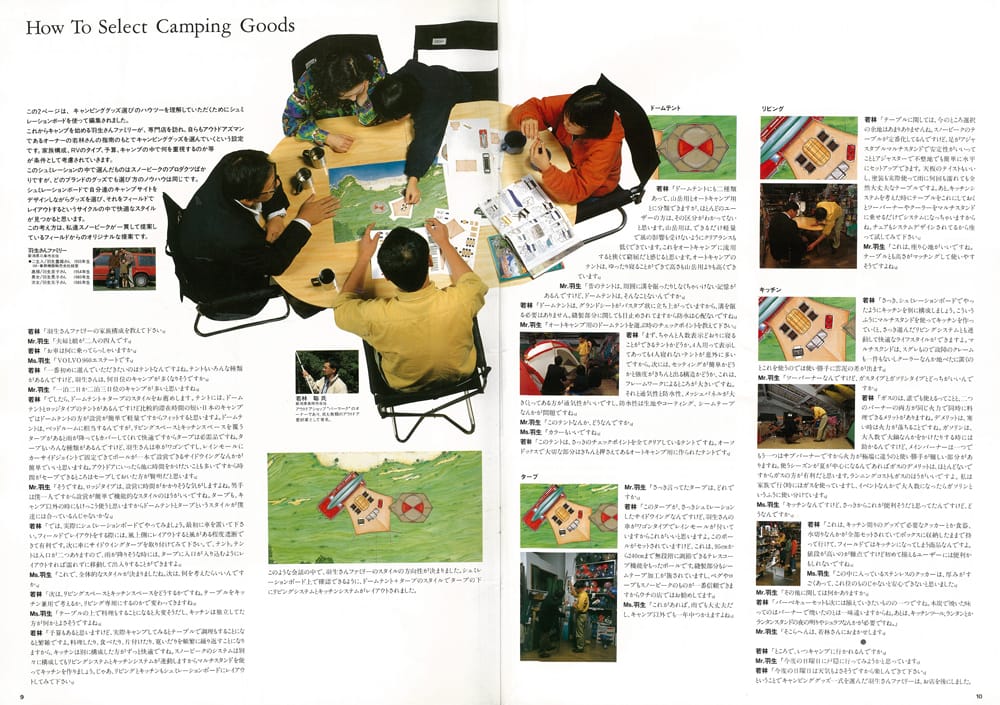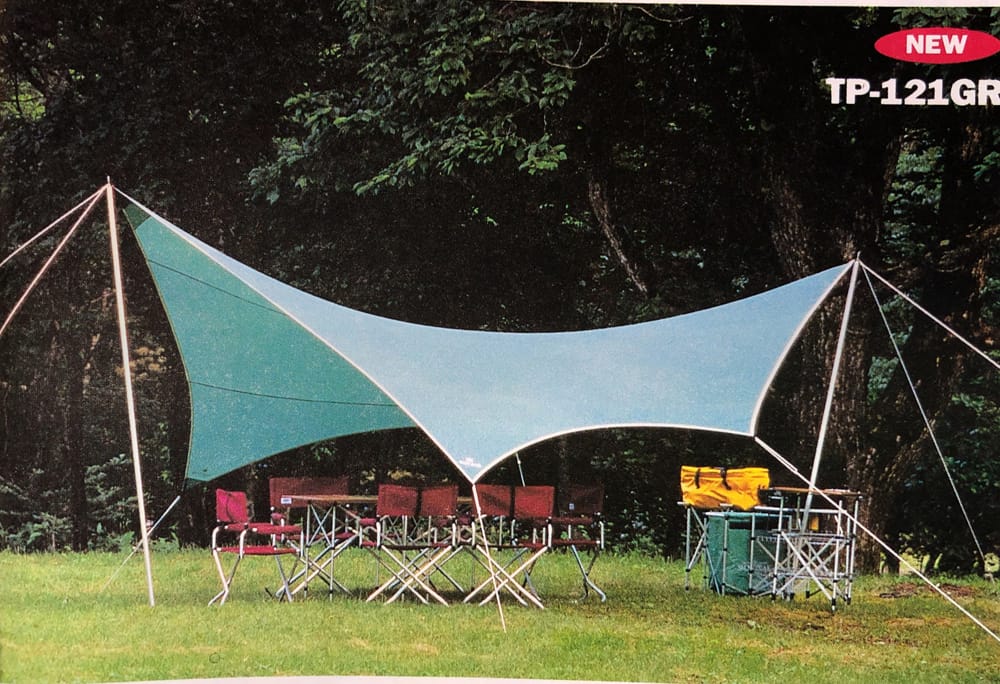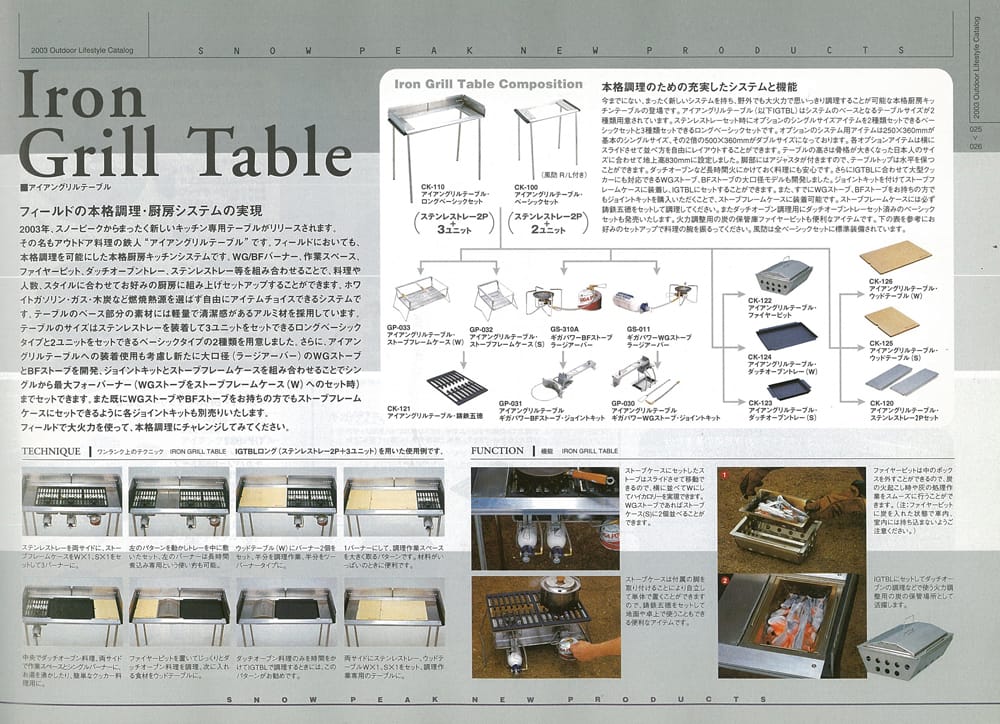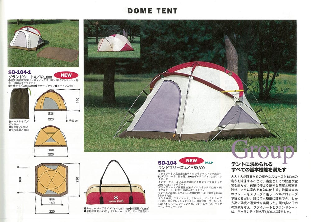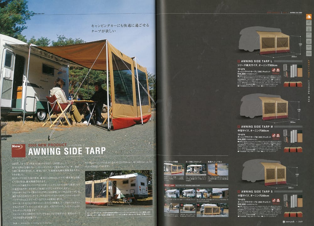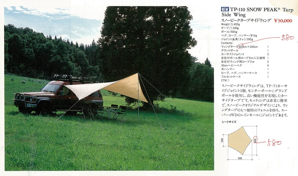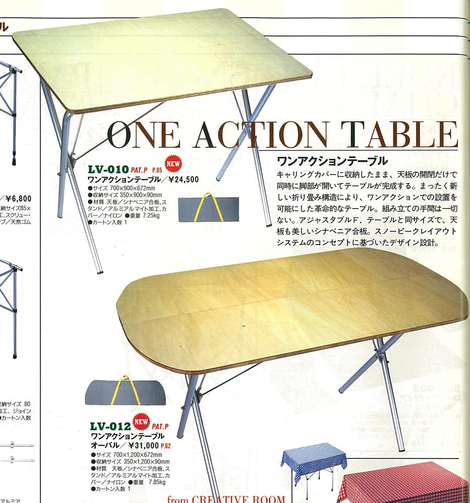 90年代に入ると、快適基準寸法という独自のサイジングを製品にデザインして、フィールドにおけるリビング・キッチン・ベッドルームというシステムを構築し、新しいライフスタイルの提案をしました。スノーピークはキャンピングギアのパイオニアメーカーとして日本のアウトドアシーンに完全に定着しました。ロゴマークは織ネームとしてタープやテントに付くだけでなく、テーブルの天板にも焼き印として刻まれました。