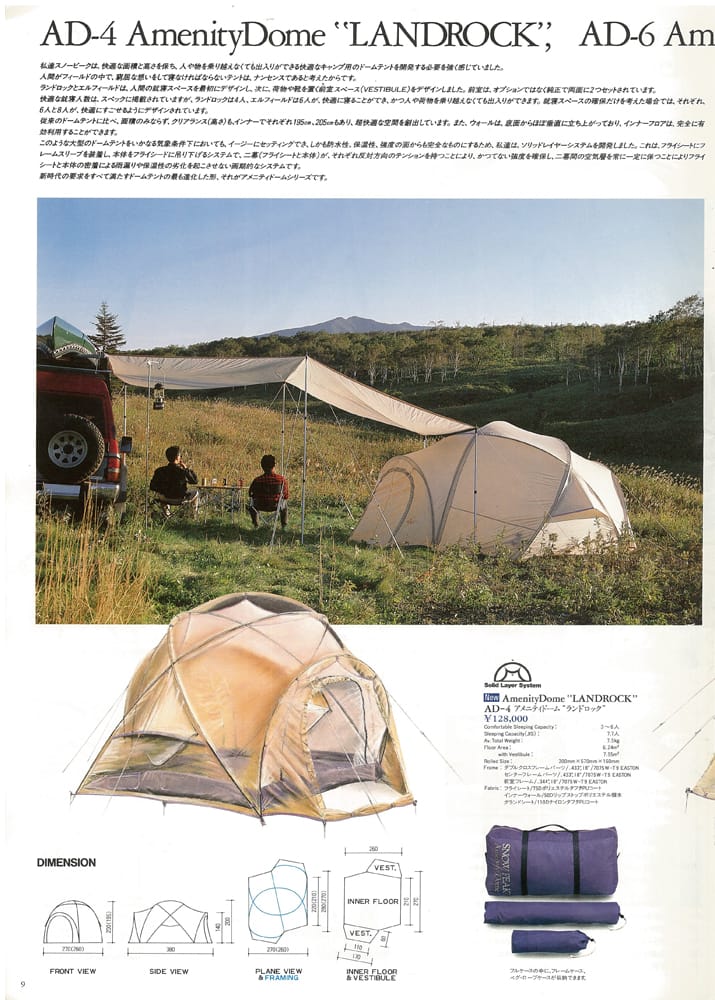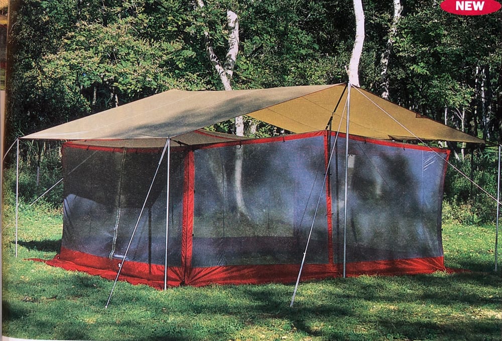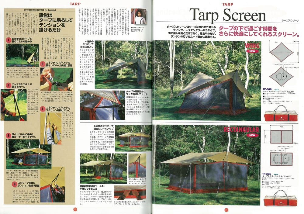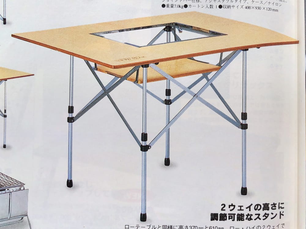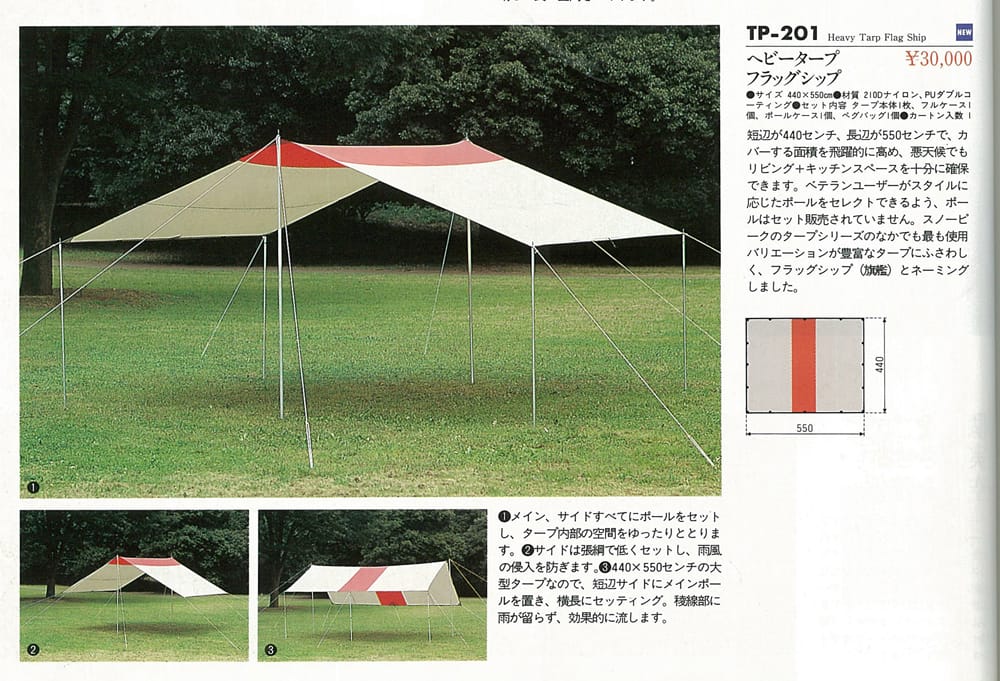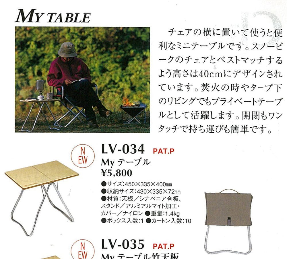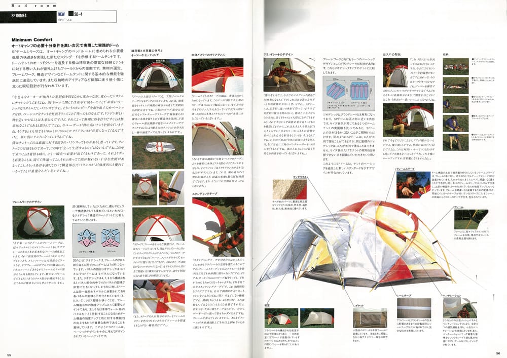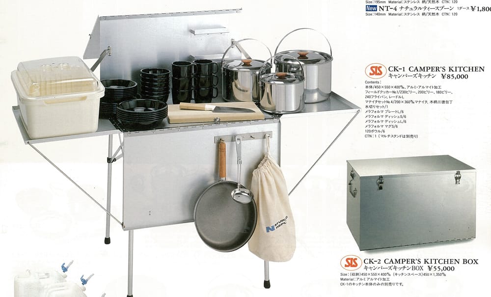 90年代に入ると、快適基準寸法という独自のサイジングを製品にデザインして、フィールドにおけるリビング・キッチン・ベッドルームというシステムを構築し、新しいライフスタイルの提案をしました。スノーピークはキャンピングギアのパイオニアメーカーとして日本のアウトドアシーンに完全に定着しました。ロゴマークは織ネームとしてタープやテントに付くだけでなく、テーブルの天板にも焼き印として刻まれました。