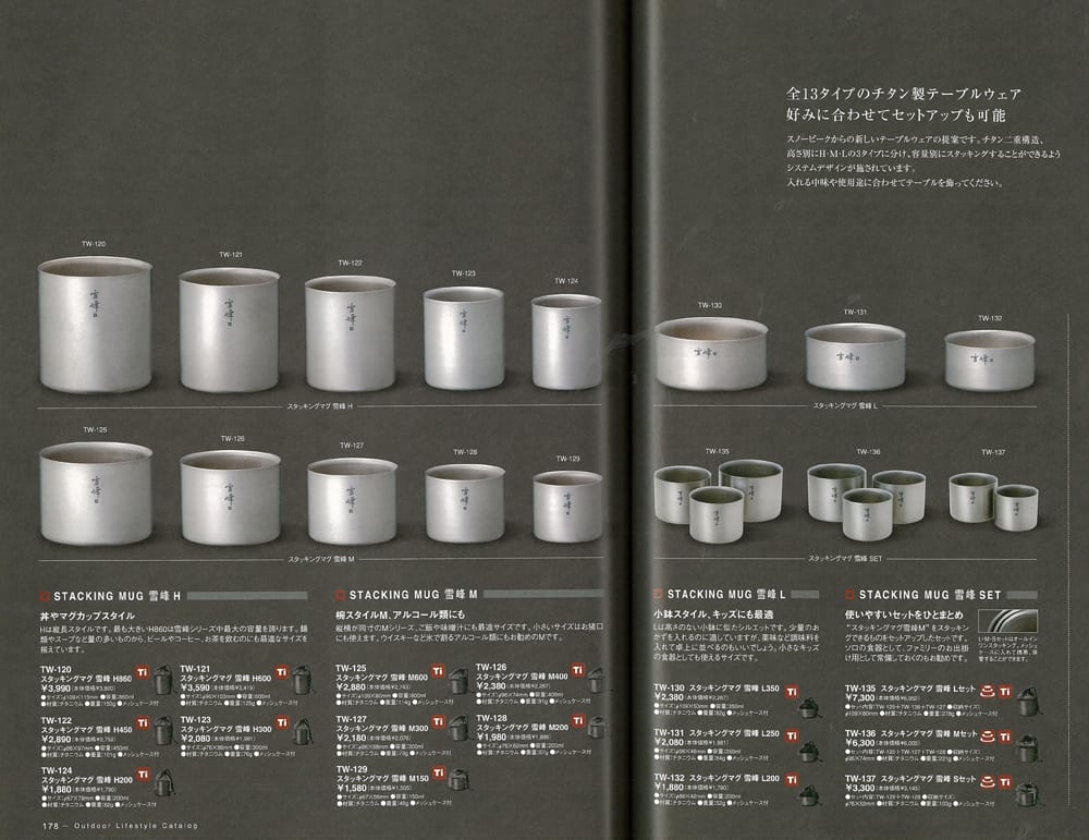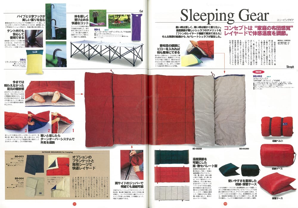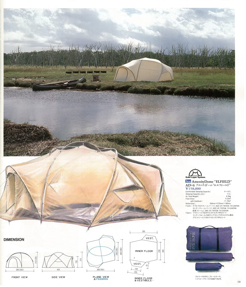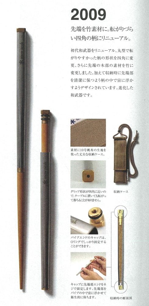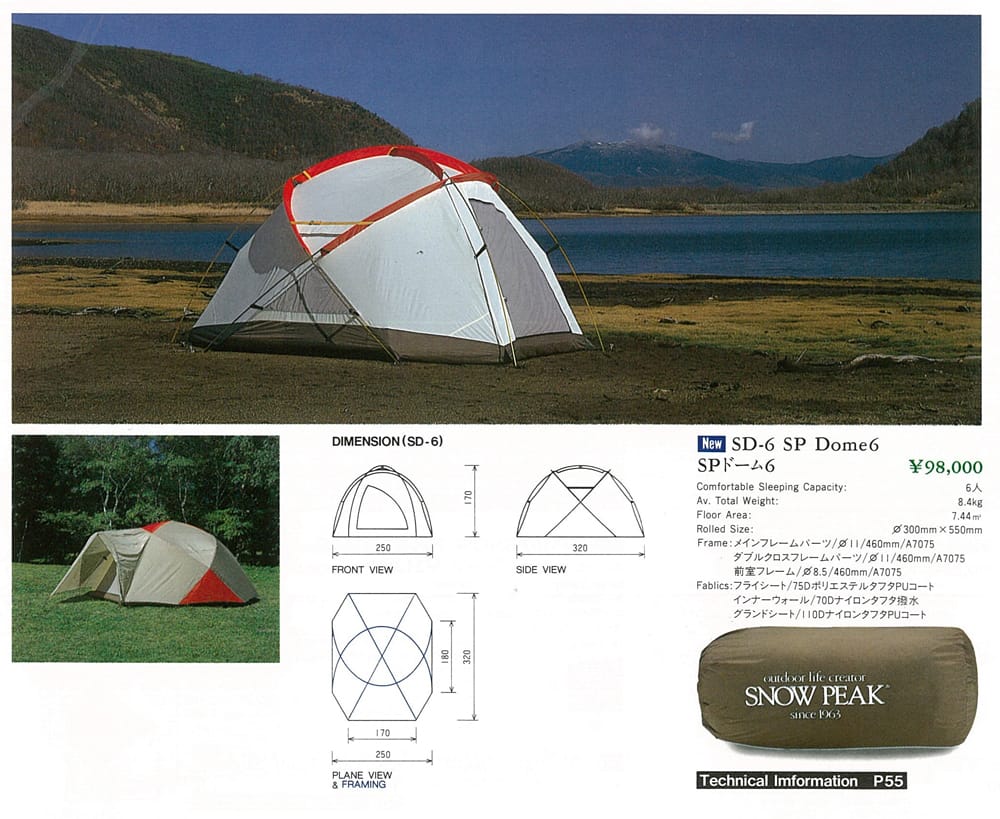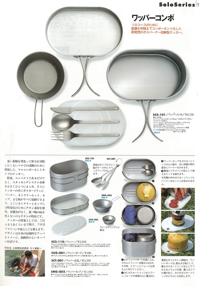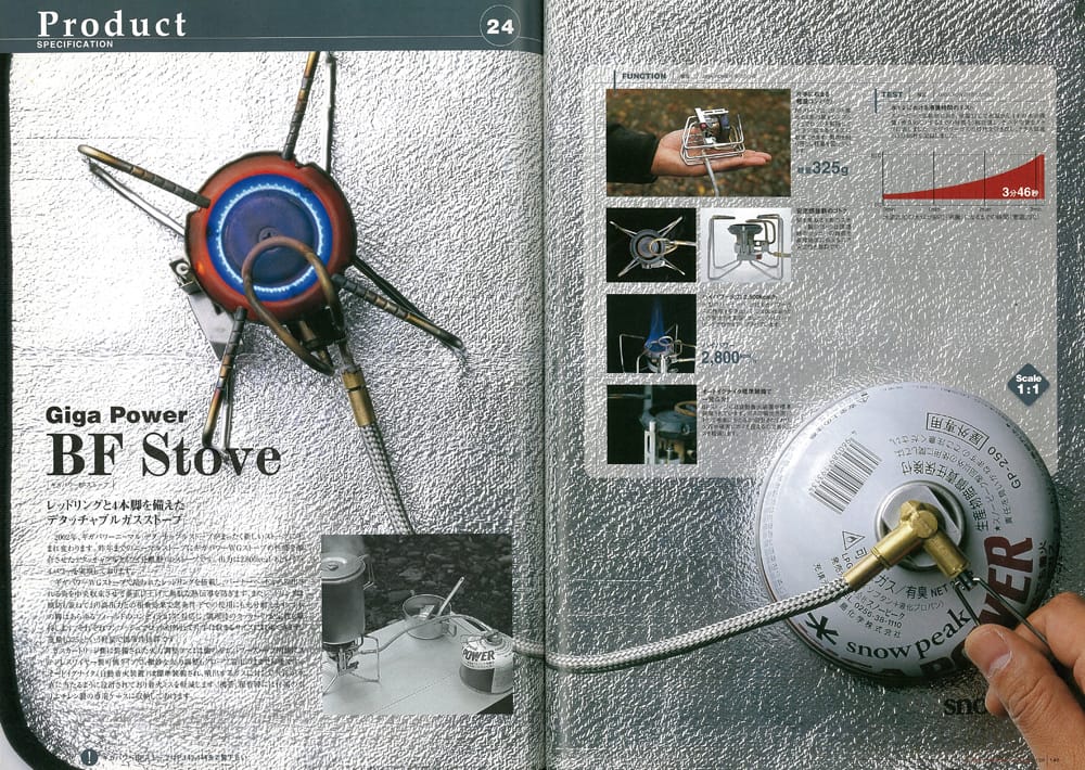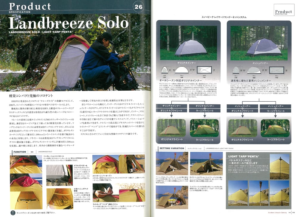 90年代に入ると、快適基準寸法という独自のサイジングを製品にデザインして、フィールドにおけるリビング・キッチン・ベッドルームというシステムを構築し、新しいライフスタイルの提案をしました。スノーピークはキャンピングギアのパイオニアメーカーとして日本のアウトドアシーンに完全に定着しました。ロゴマークは織ネームとしてタープやテントに付くだけでなく、テーブルの天板にも焼き印として刻まれました。