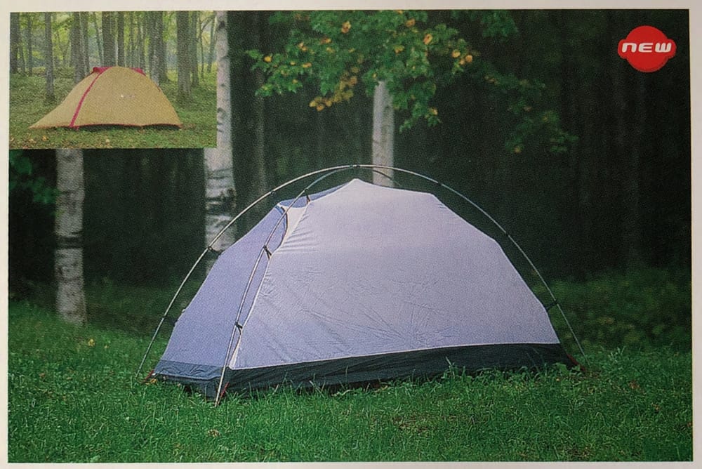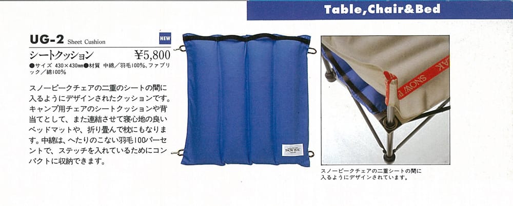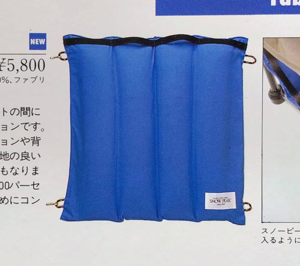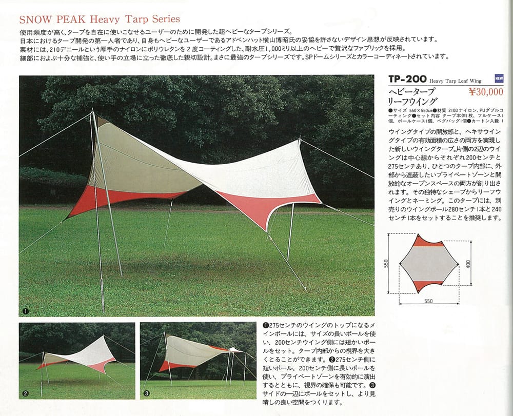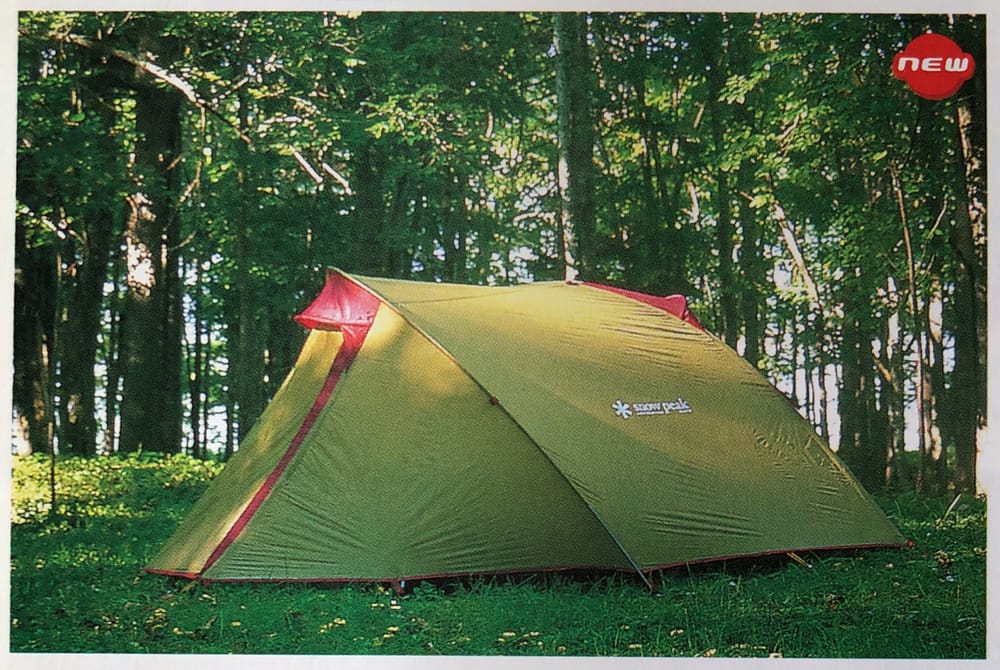 雪山のロゴマークはスマートにデザイン処理を施しました。1986年に現社長 山井太が入社し、翌'87年三条市三貫地に移転するとともに、スノーピークの代表的な商品である “マルチスタンド” をリリース、オートキャンプ用品を本格的に開発、初代フォールディングチェアの背もたれにもこのロゴマークの織ネームが輝かしく付けられました。