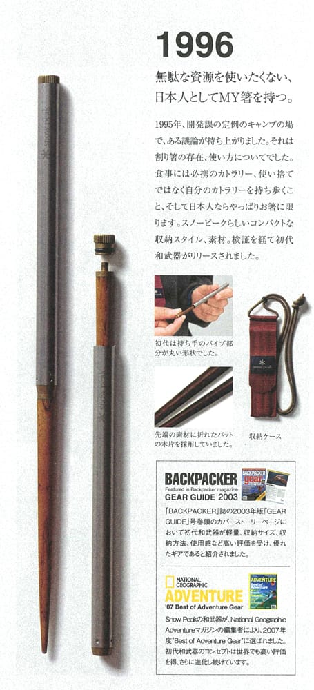 1996年、今までプランド名であった"スノーピーク"を社名として採用し現在の「株式会社スノーピーク」となりました。アスタリスクマークは雪の結晶を表現しています。同年アメリカオレゴン州レイクオスウェゴにSnow Peak U.S.Aを設立、自然と知的に遊ぶ手段のひとつとして、世界の有名フライフィッシングプランドの日本への紹介を始めました。