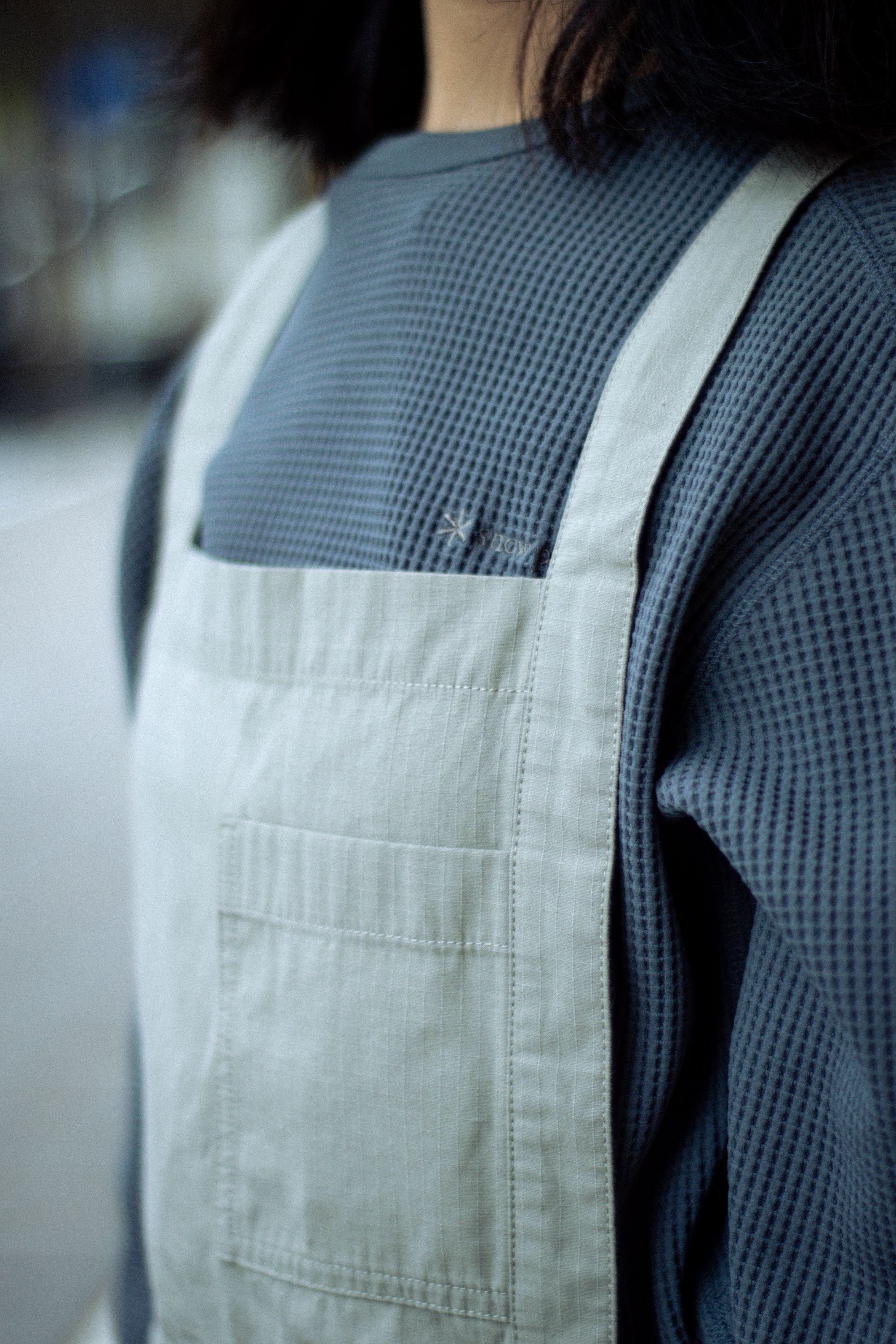 ミリタリーライクな生地の風合いにマッチした、ウィメンズのエプロン型ロングスカート。胸当て部分を取り外して、スカート単品での着用も可能な2WAY仕様。キャンプシーンでの焚火では、エプロンドレスとして着用すると胸もとまでカバーでき、肩紐は後ろ側の結び具合で長さ調節が可能です。