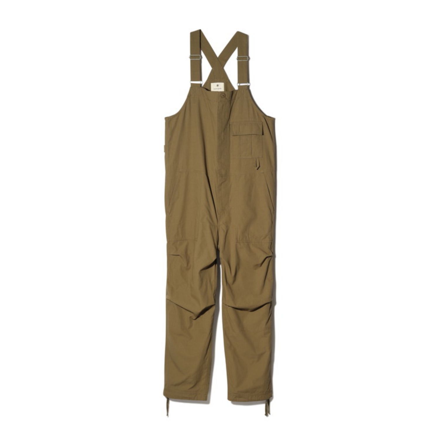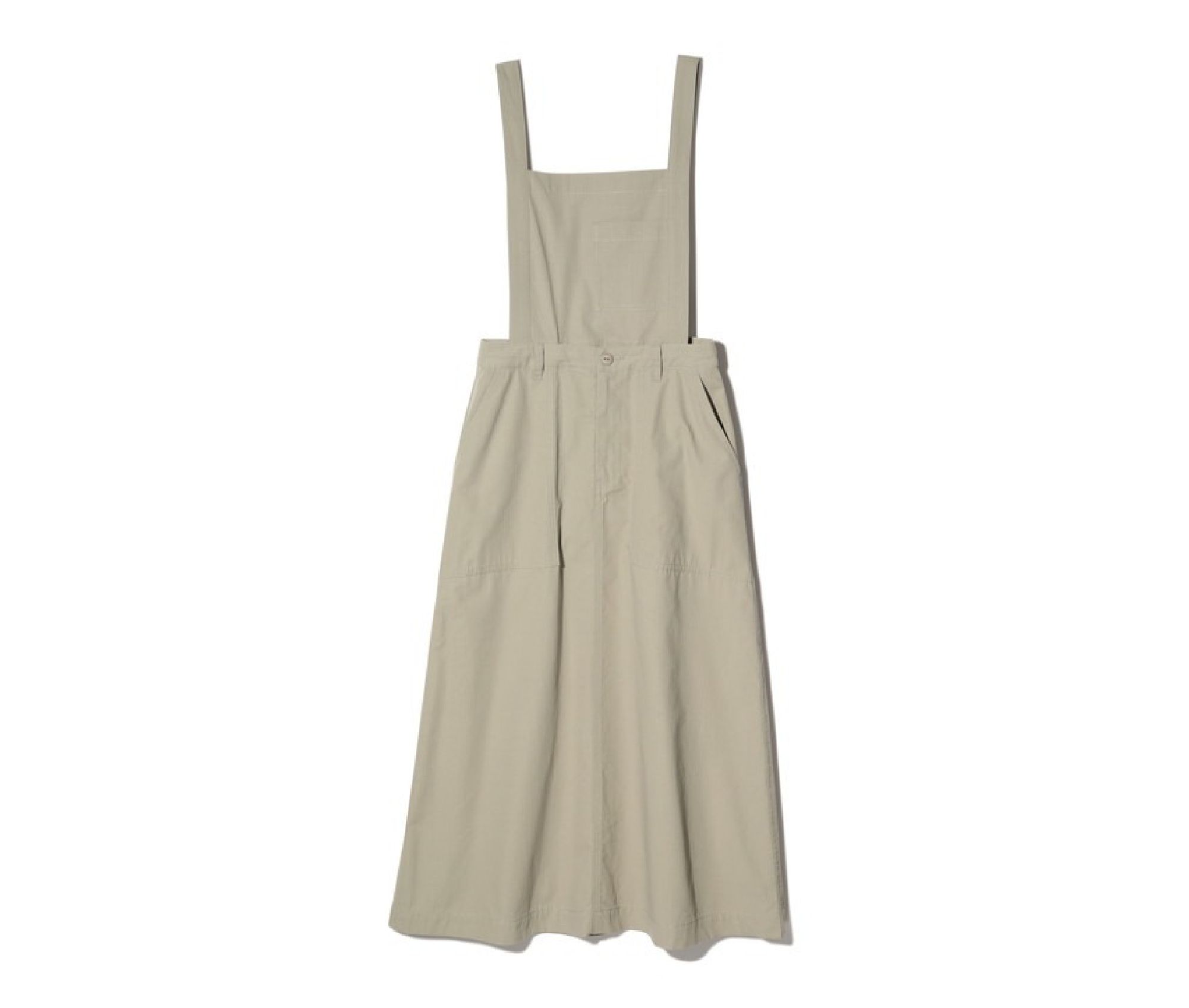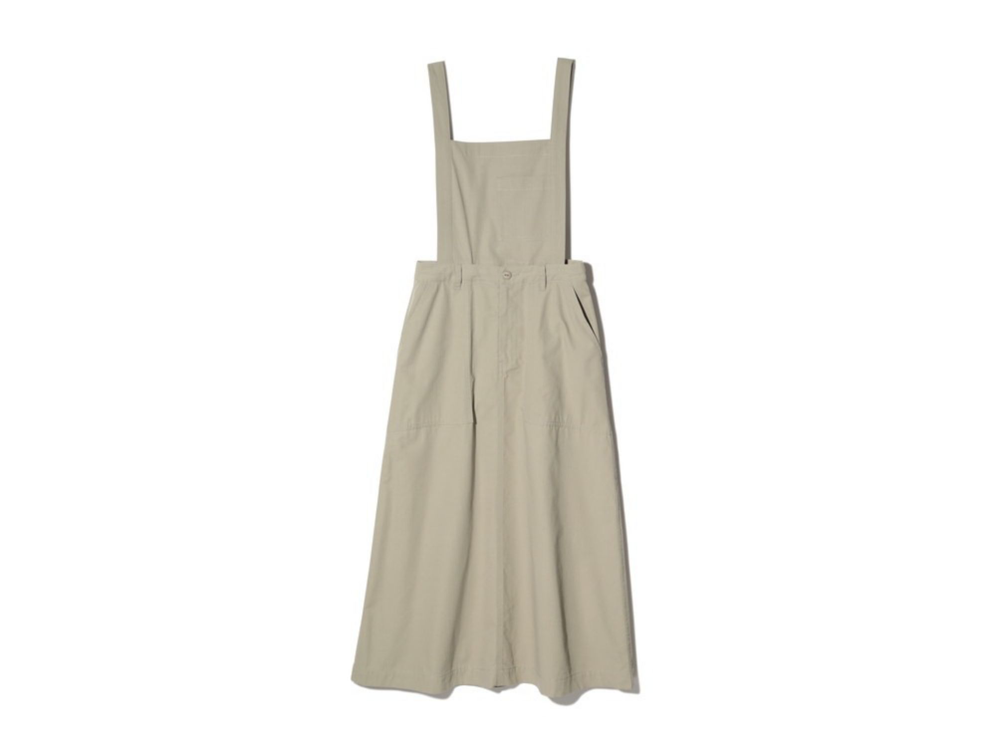 ミリタリーライクな生地の風合いにマッチした、ウィメンズのエプロン型ロングスカート。胸当て部分を取り外して、スカート単品での着用も可能な2WAY仕様。キャンプシーンでの焚火では、エプロンドレスとして着用すると胸もとまでカバーでき、肩紐は後ろ側の結び具合で長さ調節が可能です。