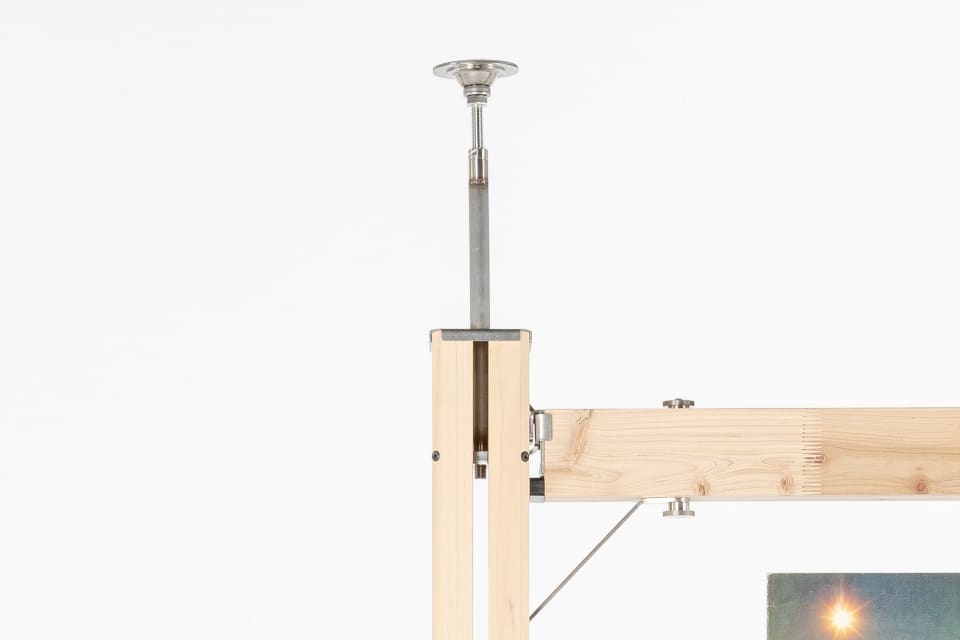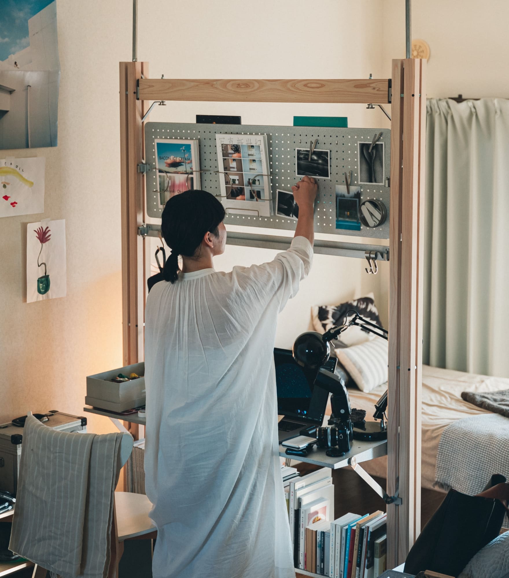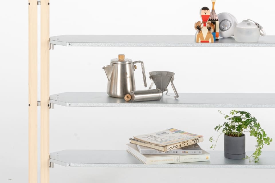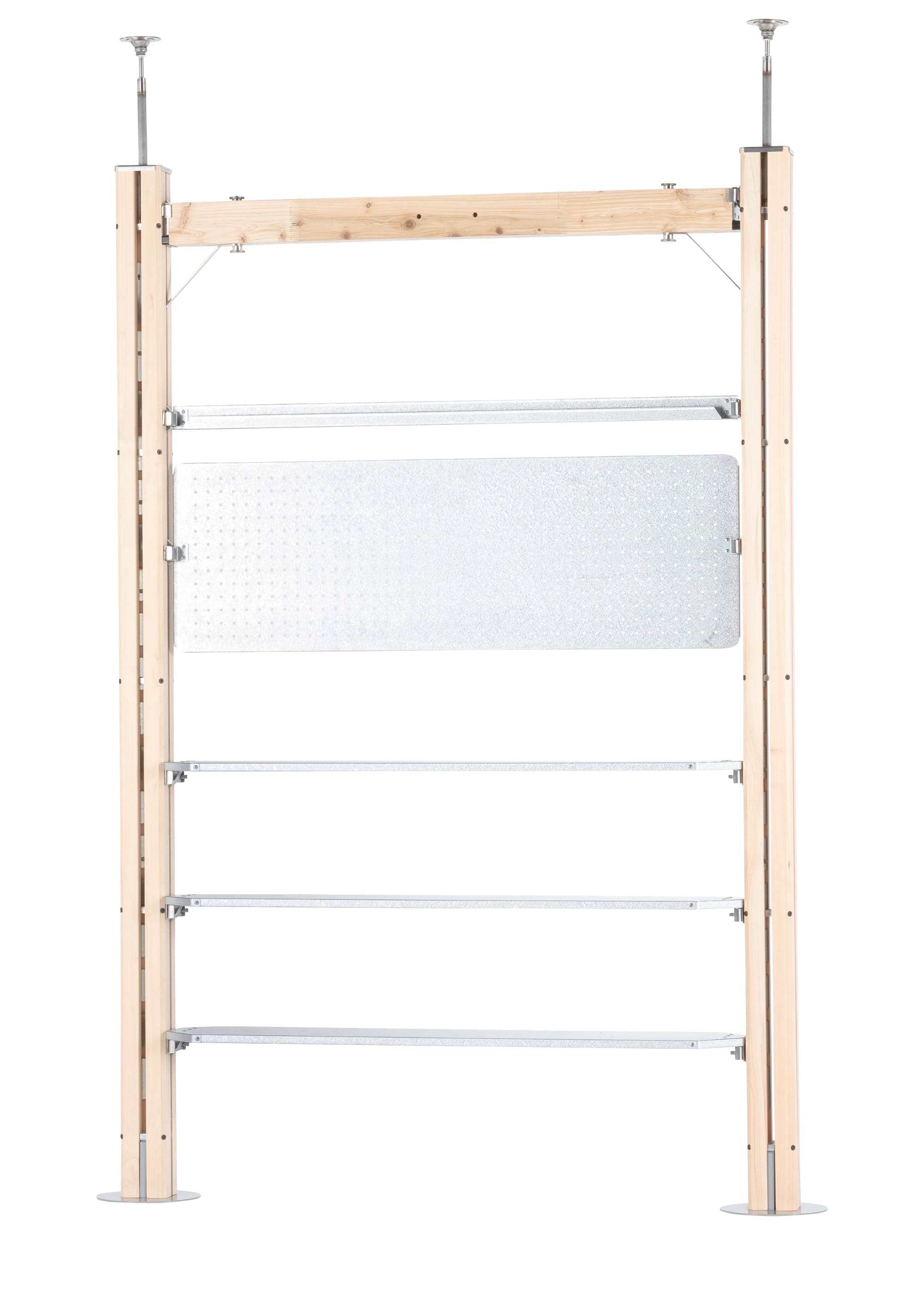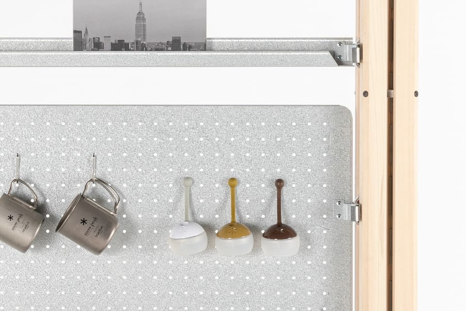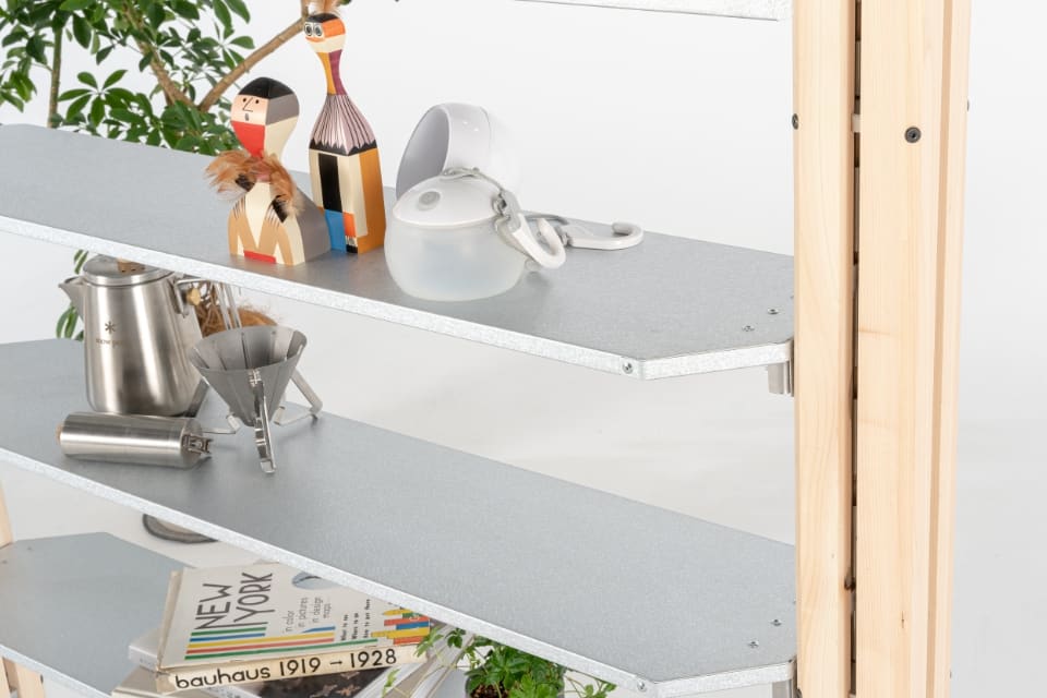 2本の支柱を壁のように立てて設置する「ウォールセット」。机や棚としてはもちろん、機能的な仕切りとしても活用可能です。この場合は付属のテンションロッドを使用し、天井に対し突っ張り棒のようにテンションをかけて固定します。最小の構成でありながら、使い方と工夫で今までにない体験が可能になるセットです。