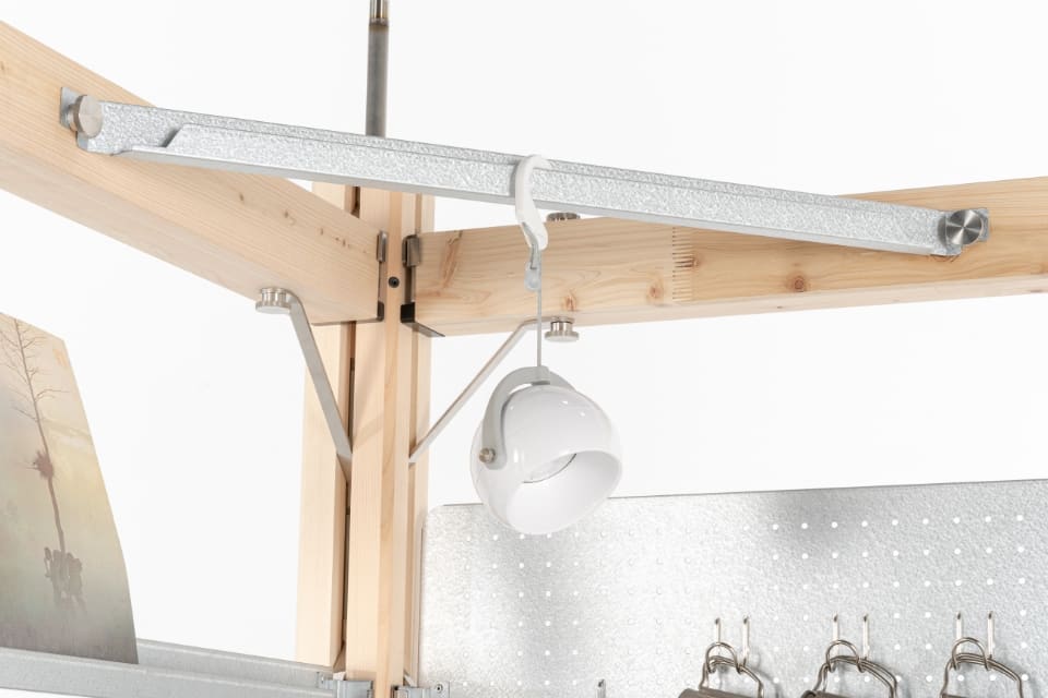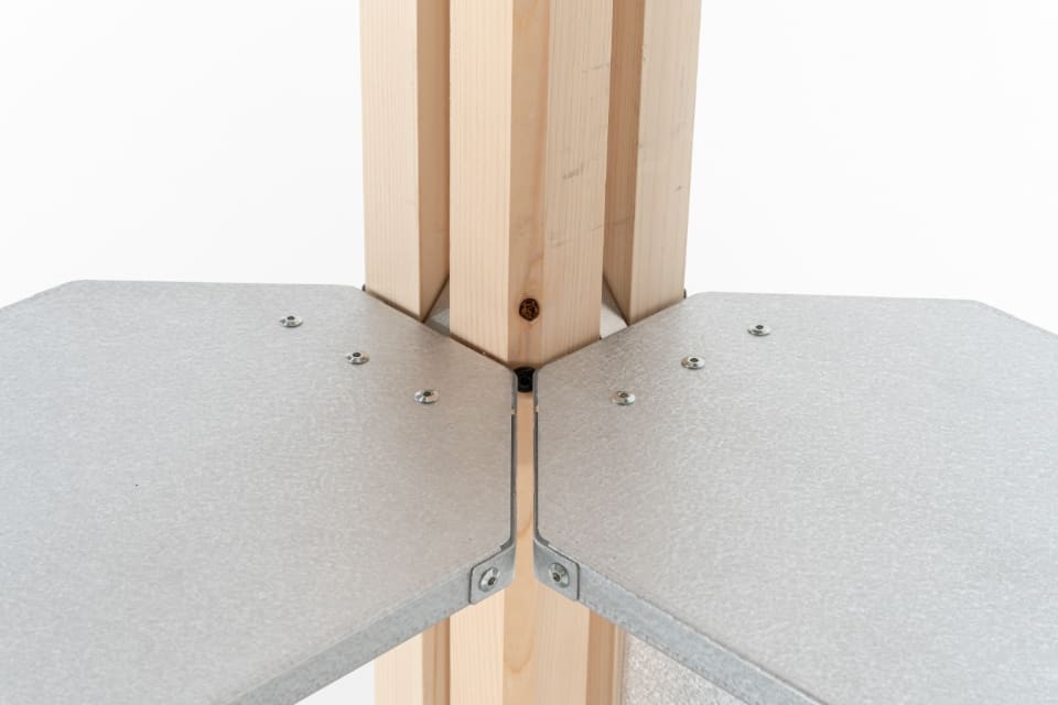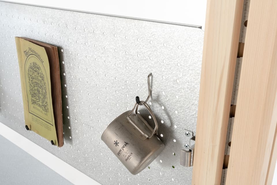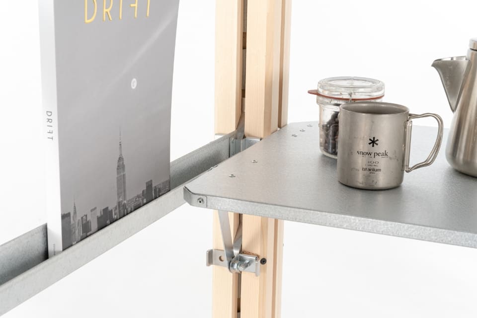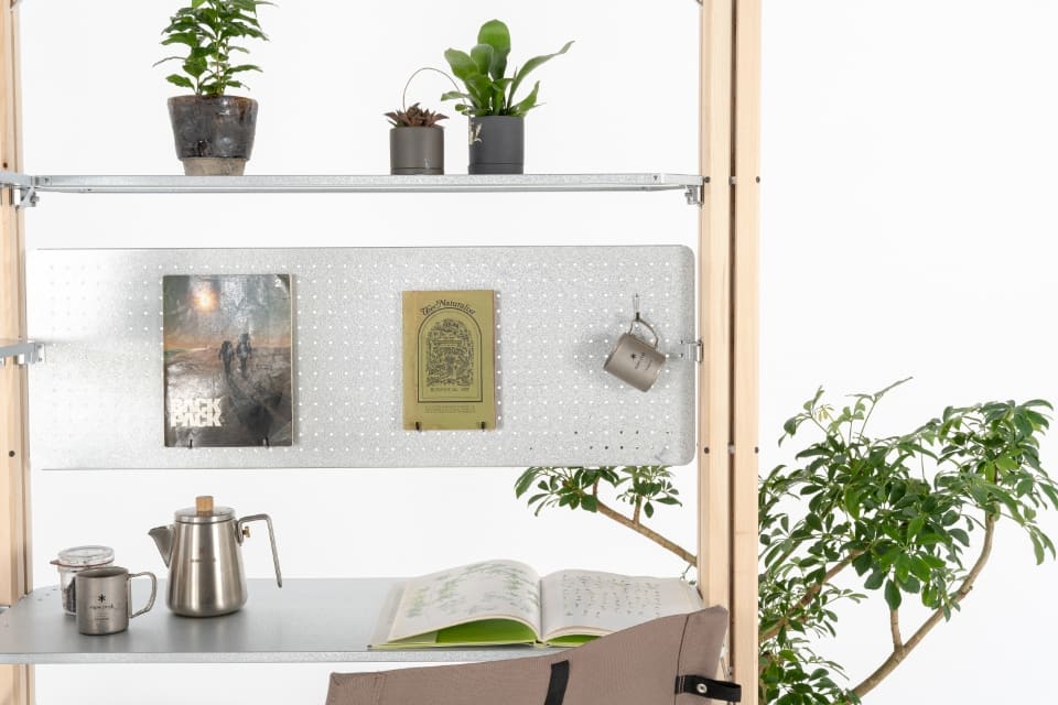 支柱3本で構成する「コーナーセット」。部屋の一角に設置し、二面を使い分けて半空間としてブースのような切り取り方をすることも可能です。パーツの種類や位置を自由に組み合わせて、より自分らしく生きる空間をつくることができる基本構成となります。